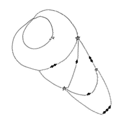 Calling all fashionistas! This four strand asymetrical necklace will make you feel like a star! Alternating beads of black chalcedony and silver coated hematite adorn the chain strands while three sterling silver oxidized stars join the strands together. This piece is perfect for a western addition to your fashionable look!Feature
