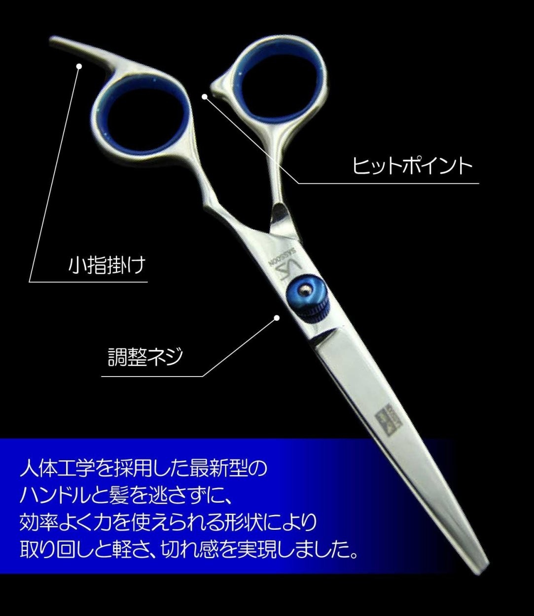 小指かけがあり、ヒットポイントなど持ち手が非常に使いやすい作りになっており、カットの際にストレスがかからないように工夫されています。