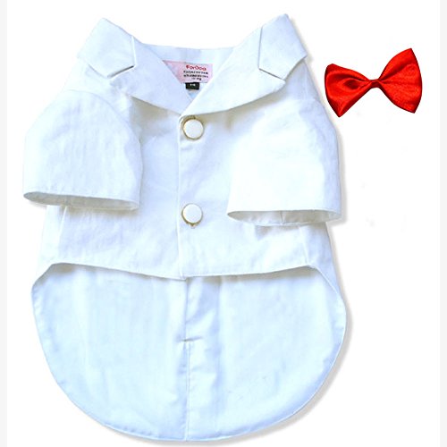 -. Feature : The dog wedding suit is made of high quality thick cotton fabric and good lining as a formal tuxedo for your pets. And it comes with a adjustable red bowtie. It is different from normal pet shirt as it is thick tuxedo cutting that in good fit and high level like a gentleman tails. / The white color dog tuxedo is so special and outlooking provide different look for your pets. / Size available from XS,S,M,L,XL,XXL Suitable for small,medium and large dogs. Any breeds of dogs could find his size. / Great for special occasion and weekend party, weddings, New Year's Eve, Valentine's Day, special occasions, as well as Halloween. / Good matching with female dog wedding dress. It is special design for wedding and party suit for pets.