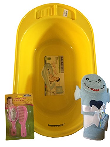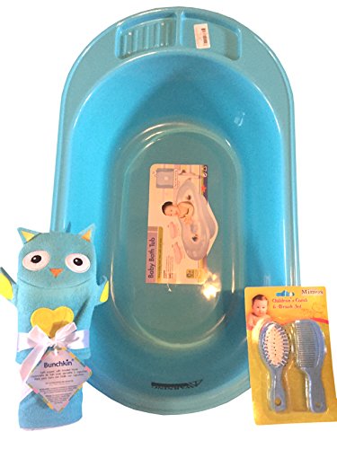 This bundle come with 1 blue bath tub will also come with character puppet and towel that will be randomly picked. Brand new baby bath bundle for you new baby . Comes with new mimo baby bath, new baby towel with hand puppet , and new baby comb and brush combo that will be blue everything you need to get started. This bundle comes in blue and has a blue brush comb combo and random caricature puppets.