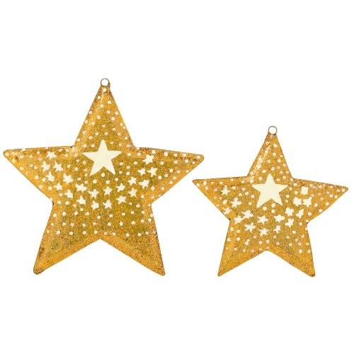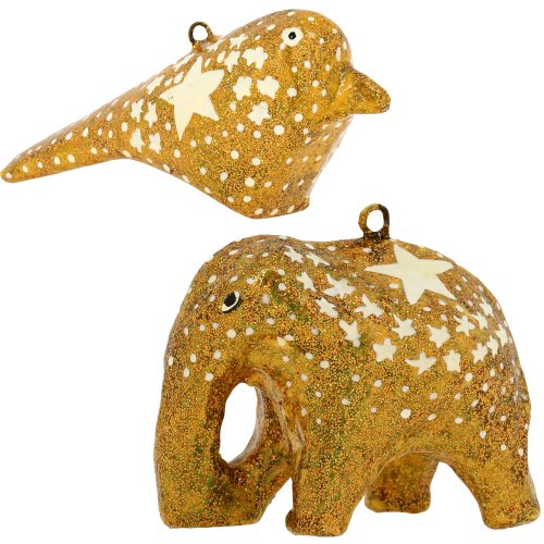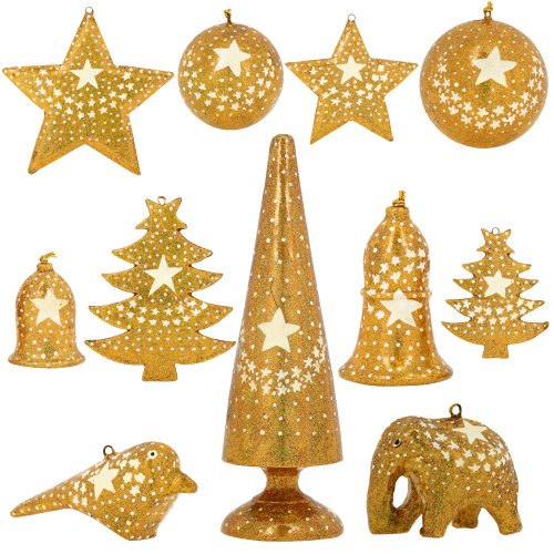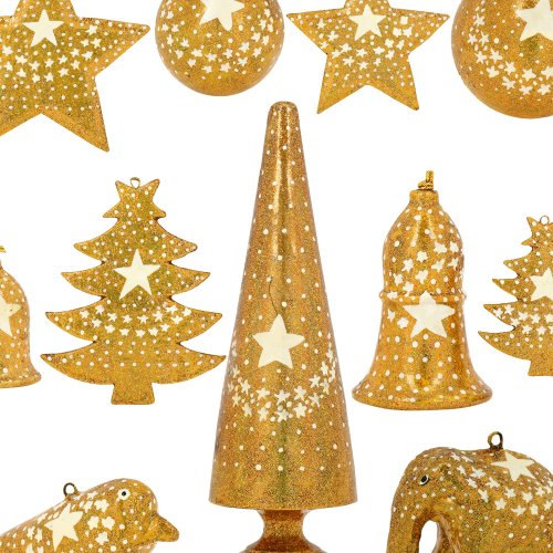 -. Binding : Kitchen -. Brand : ShalinIndia -. Color : Gold -. EAN : 5055384740924 -. Feature : Handmade gifts produced in Kashmir, India / Includes a total of 11 Christmas ornaments with Eastern and Western designs / Luxe design in yellow gold with white star motif over top / Integrated loops make the ornaments simple to hang / Ornament size ranges from 2 to 8 inches -. IsAutographed : 0 -. Label : ShalinCraft -. Manufacturer : ShalinCraft -. Model : MN-paper_mache_decor_set_gold_star -. MPN : MPN-paper_mache_decor_set_gold_star -. PackageQuantity : 1 -. PartNumber : MPN-paper_mache_decor_set_gold_star -. ProductGroup : Home -. ProductTypeName : HOME -. Publisher : ShalinCraft -. Size : 3 IN -. Studio : ShalinCraft -. Title : Set of 11 Gold Star Paper Mache Decorative Christmas Ornaments - Handmade Xmas Decor