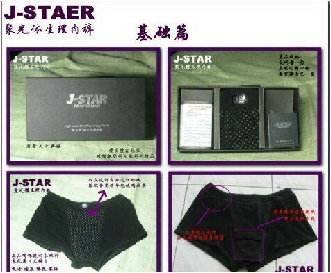J-STAR(聚光体)男士生理内裤是由美国MANKIND HEALTH CAREACADEMICASSOCIATION与法国SENWA-Y INTERNATIONAL GROUP共同研制,鼎晶宇科技国际集团有限公司开发的达世界先进水平的重点科技产业化项目-——远红外线纳米碳素磁疗保健裤。并由来自全球的一千多名医学专家博士与人体力学专家,纺织专家等多个相关领域技术工程通力协作,结合纳米技术、远红外、负离子与香薰疗法,独家研发出对男性生理具有创新性,特色疗法的保健产品