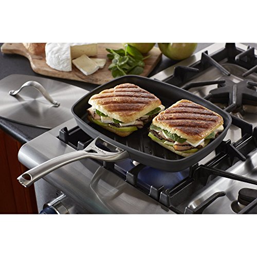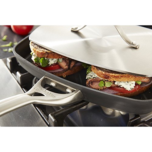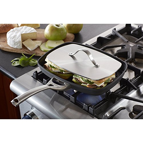 Featuring a hard-anodized exterior and nonstick interior. Calphalon ContemporaryNonstick combines durability and performance with fast clean-up and easy low-fat cooking.. Heavy-gauge aluminum construction ensures even heating and is hard-anodized for durability. It also makes it dishwasher-safe. Interior includes three layers of nonstick coating – two layers provide durability and the third layer offers easy release performance. The long, brushed stainless steel handles are designed to stay cool on the stovetop. Pans and covers are also oven safe, making it ideal for finishing a gourmet dish. Use press to make panini sandwiches, sear chicken and other meats, or even grill vegetables. The unique ridges leave authentic grill marks on foods and help drain unwanted fat. The nonstick surface means you can cook healthier using less fat, with effortless cleanup. Comes with Calphalon's full lifetime warranty.Feature