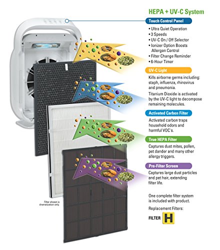 True HEPA Filter captures 99.97% of dust and allergens as small as .3 microns such as household dust, pet dander, mold spores and plant pollens. Activated granular carbon filter reduces odors from pets, smoking, cooking along with harmful VOC's emitted from a variety of household products and chemicals.