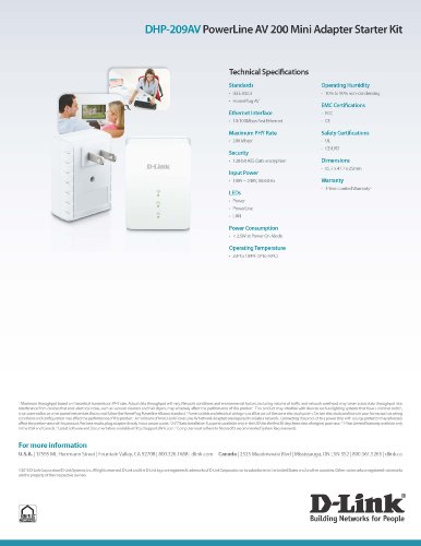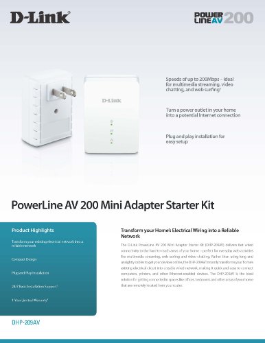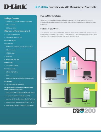 -. Binding : Personal Computers -. Brand : D-Link -. EAN : 0014444453162 -. Feature : Expand your Wired Network - Easily add Ethernet devices like computers, media players, and printers to your network without additional cables / Performance - Speeds of up to 200Mbps - Ideal for multimedia streaming, video chatting, and web surfing / Scalable to your Needs - Easily expand your network with additional PowerLine adapters / Compact Design - Small form factor doesn't block other wall outlet plugs / Plug and Play Installation - Quickly setup your PowerLine adapters with the push of a button -. Label : D-Link Systems, Inc. -. Manufacturer : D-Link Systems, Inc. -. Model : DHP-209AV -. MPN : DHP-209AV -. NumberOfItems : 1 -. PackageQuantity : 1 -. PartNumber : DHP-209AV -. ProductGroup : Personal Computer -. ProductTypeName : NETWORKING_DEVICE -. Publisher : D-Link Systems, Inc. -. Studio : D-Link Systems, Inc. -. Title : D-Link PowerLine AV 200 Mini Adapter Starter Kit (DHP-209AV) -. UPC : 014444453162 -. Warranty : 1 year limited