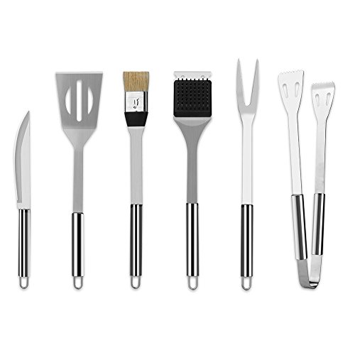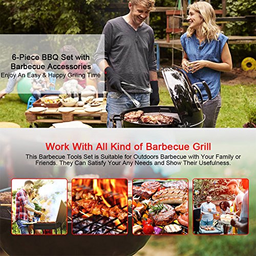 - Durable and easy to clean: All stainless steel, this 6-piece grill set won’t chip, tarnish or rust.Grill set includes chef's spatula, grill tongs, cleaning brush,scraper,grill brush,BBQ fork.The kit size is 14.5“*3.8”*3“.