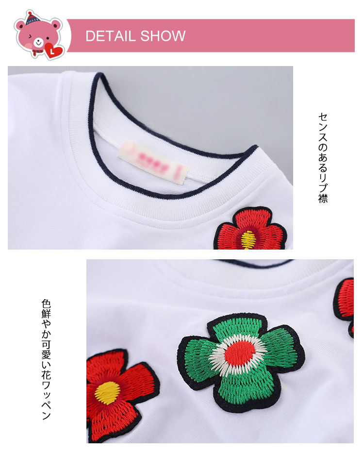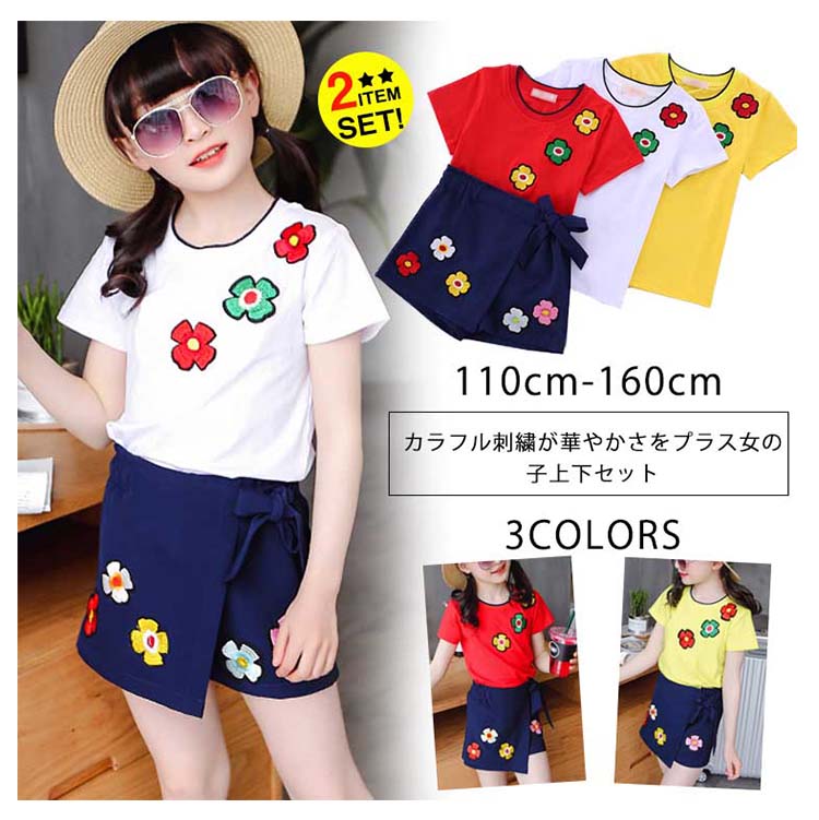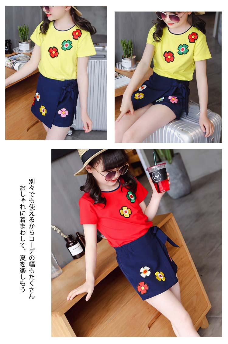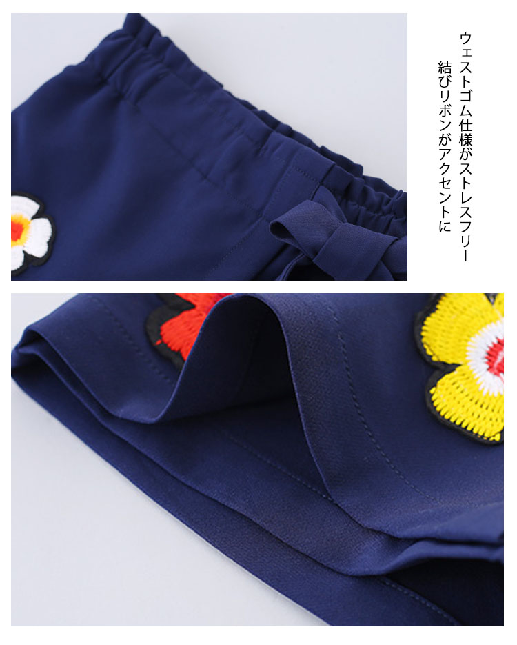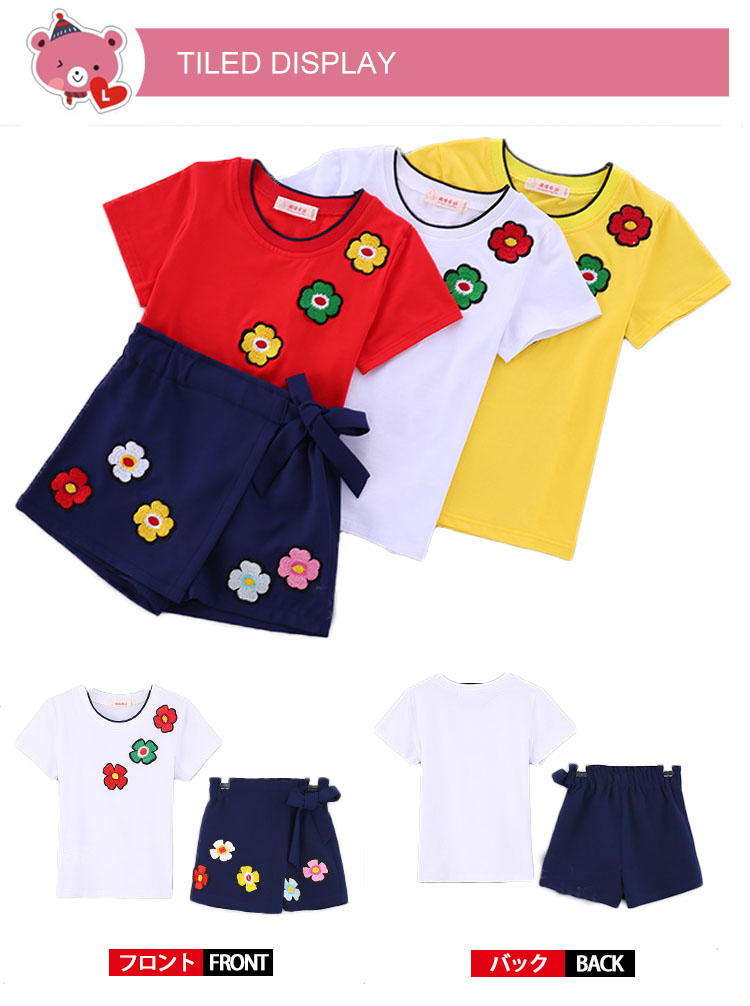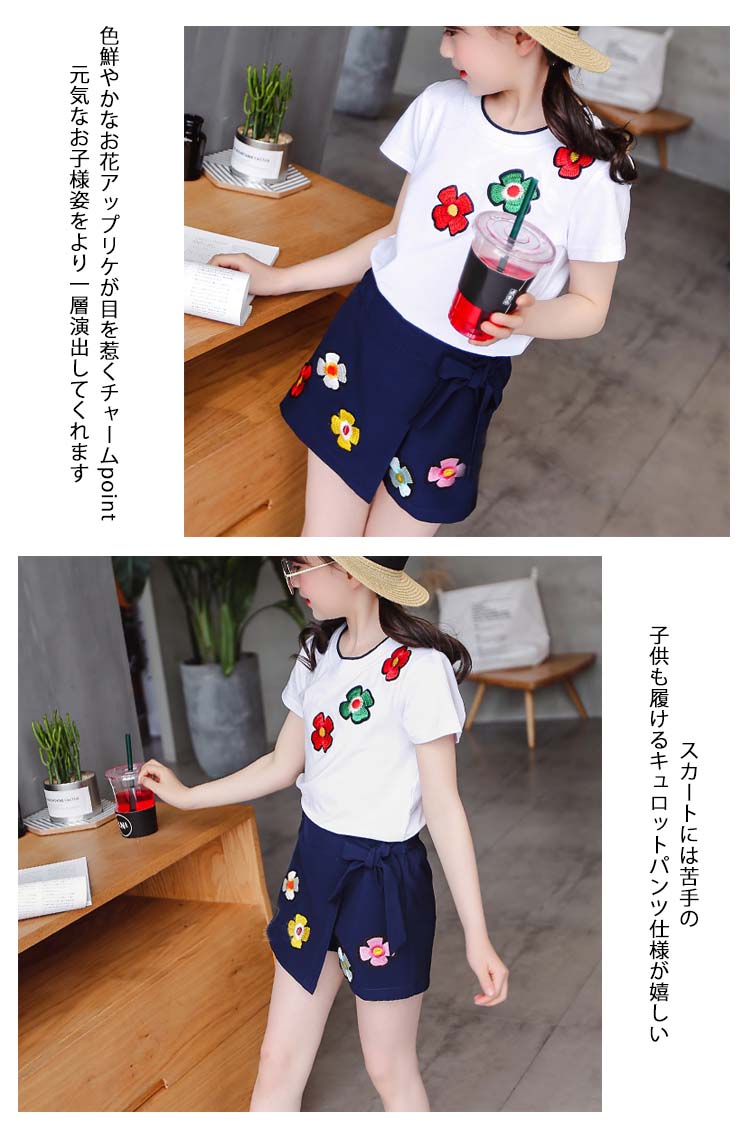 | カラフル刺繍が華やかさをプラス女の子上下セット色鮮やかなお花アップリケが目を惹くチャームpoint元気なお子様姿をより一層演出してくれますスカートには苦手の子供も履けるキュロットパンツ仕様が嬉しい別々でも使えるからコーデの幅もたくさんおしゃれに着まわして、夏を楽しもう | |