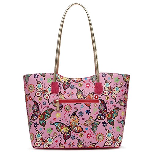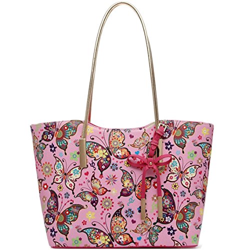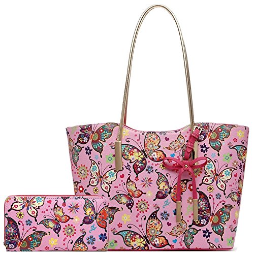 Fashion Colorful Butterfly Flower Shopper Totes Bowknot Women Purse Handbag Shoulder Bag Wallet Set Pink