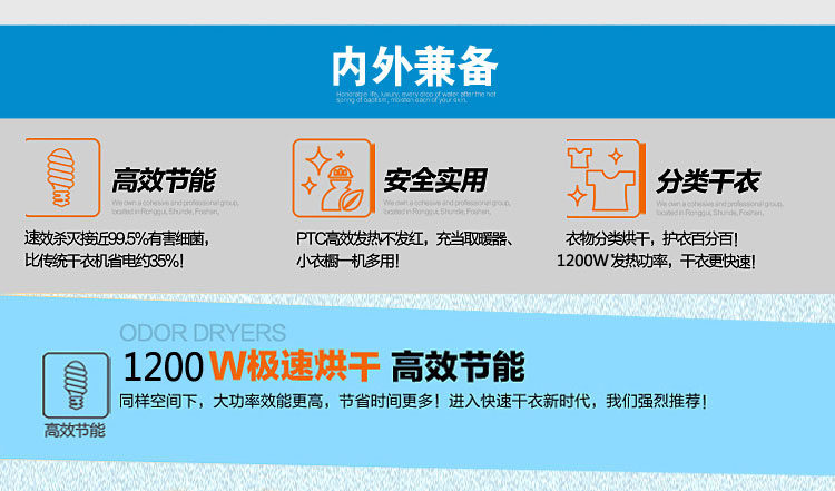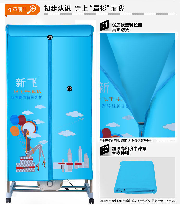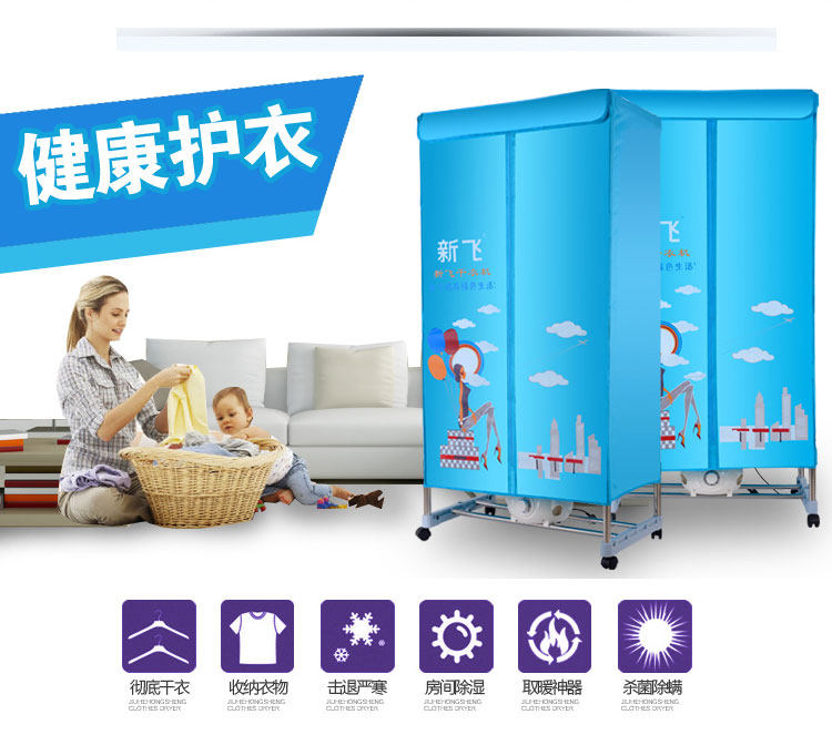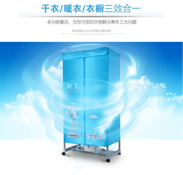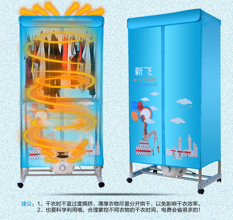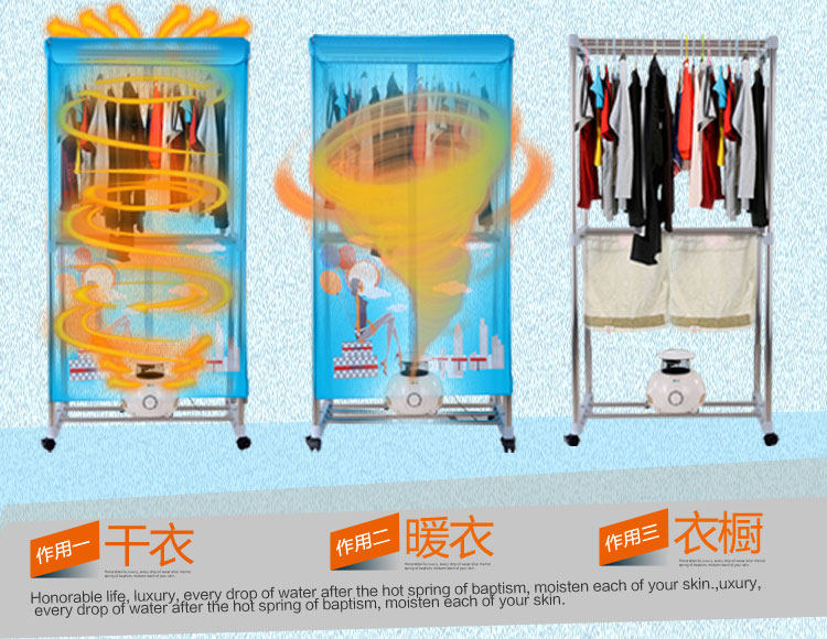 独立主机,PTC陶瓷发热,发热过程中无明火,双重过热保护,温度恒定安全可靠,安全节能。并采用360度全方位超大角度立体送风方式,热效率高,加快蒸气蒸发速度,达到快速干衣。并设有多项热保护装置和防触电及自动断电保护装置。它是一台暖风机,起到冬天取暖的作用;其次,在不用干衣的情况下,可以作为一个漂亮的衣柜存放衣物,静态消毒。可以把刚洗过的衣物在很短的时间内烘干并具有消毒功能。一机多用,干衣、取暖、杀菌、衣柜、衣帽架,烘干、鞋子、毛公仔等集暖风、干衣机和衣柜于一身。