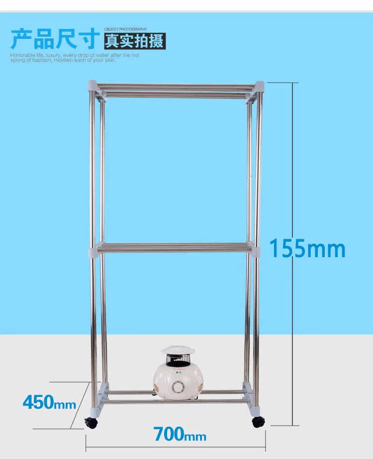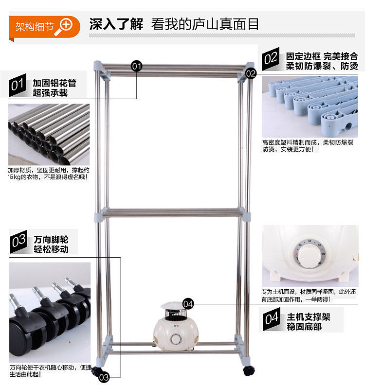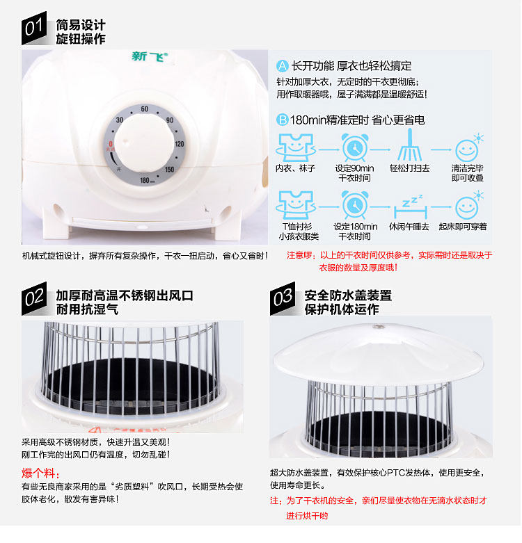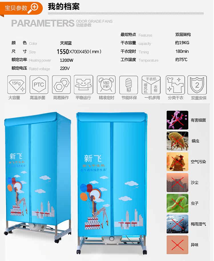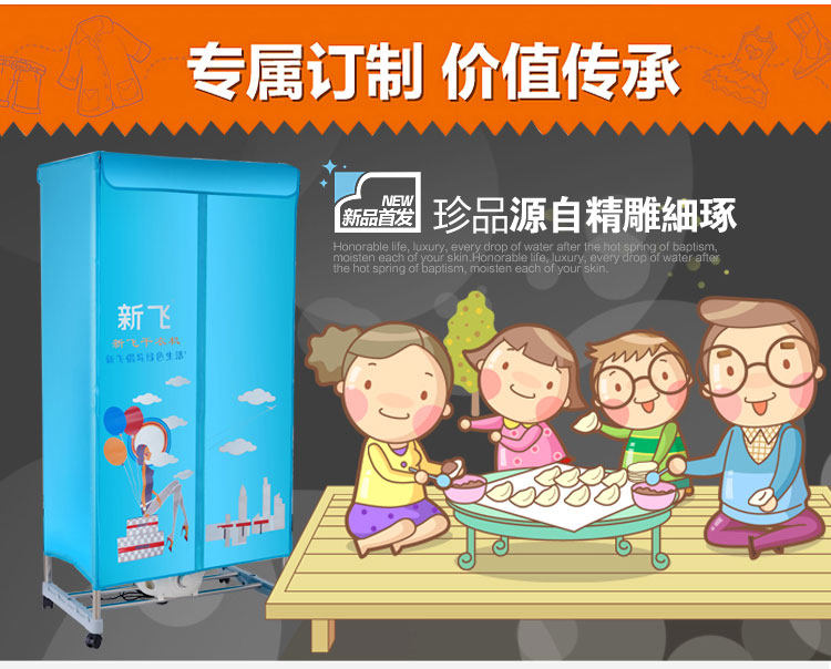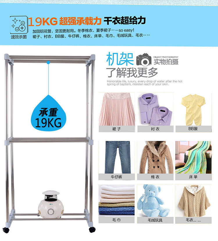 独立主机,PTC陶瓷发热,发热过程中无明火,双重过热保护,温度恒定安全可靠,安全节能。并采用360度全方位超大角度立体送风方式,热效率高,加快蒸气蒸发速度,达到快速干衣。并设有多项热保护装置和防触电及自动断电保护装置。它是一台暖风机,起到冬天取暖的作用;其次,在不用干衣的情况下,可以作为一个漂亮的衣柜存放衣物,静态消毒。可以把刚洗过的衣物在很短的时间内烘干并具有消毒功能。一机多用,干衣、取暖、杀菌、衣柜、衣帽架,烘干、鞋子、毛公仔等集暖风、干衣机和衣柜于一身。