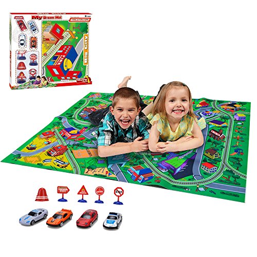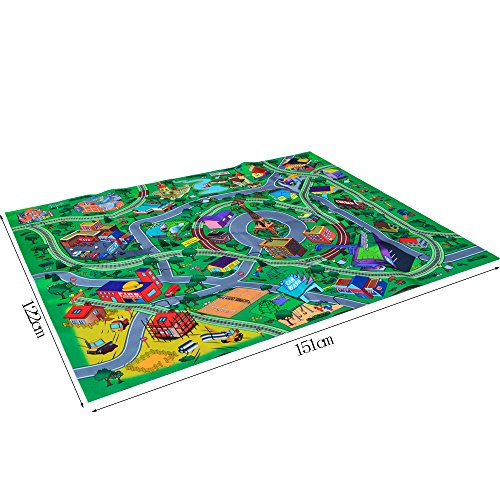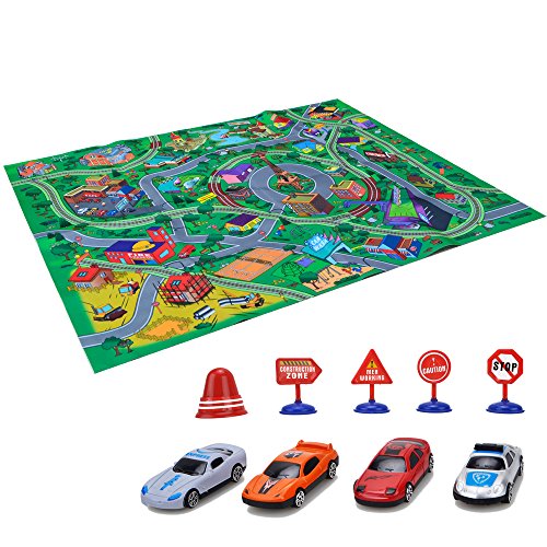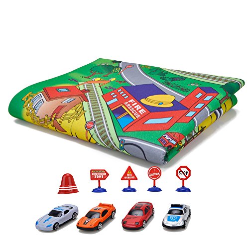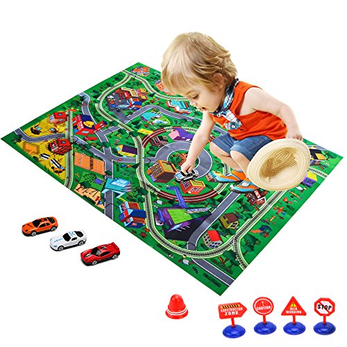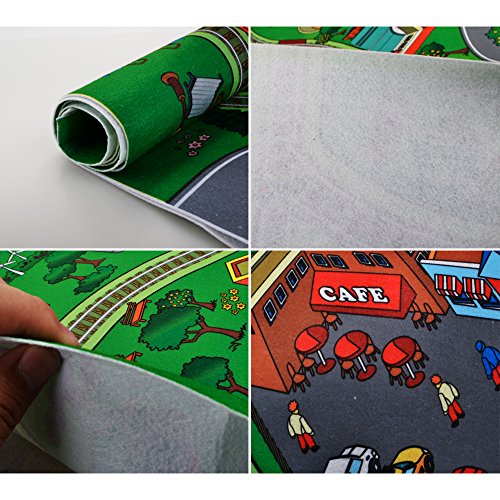 -. Feature : Playmat approx size:59*47.2 inches,big enough for your little one to play on / Soft, durable material, skid-proof backing and reinforced border binding / Content:big city playmat,4 toy cars and 5 traffic signs,suitable for ages 3+ years old / Your child will learn about city and community life, traffic ,colors, numbers and more.It also can play together with friends. / The best gift for children,colorful cartoon design for attracting toddler's attention and stimulating children's observation ability