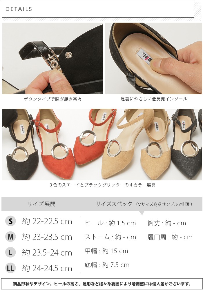 | カラー | 01. ブラックグリッター 02. ブラックスエード 03. ベージュスエード 04. オレンジスエード |