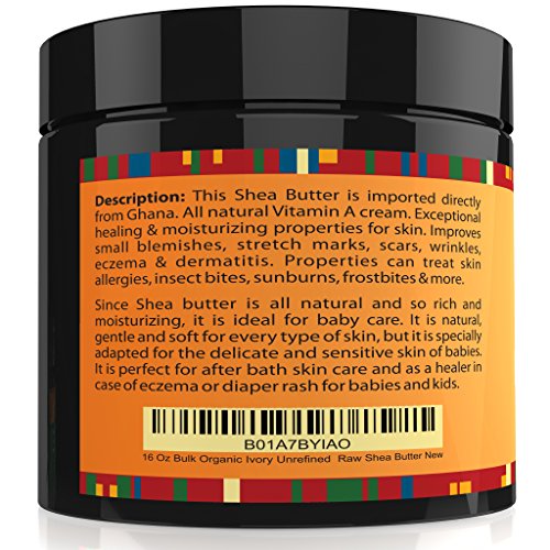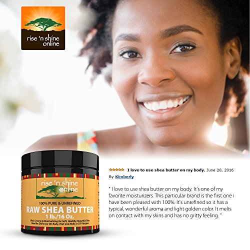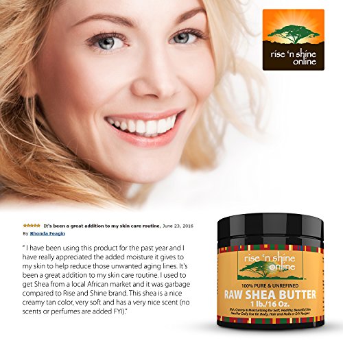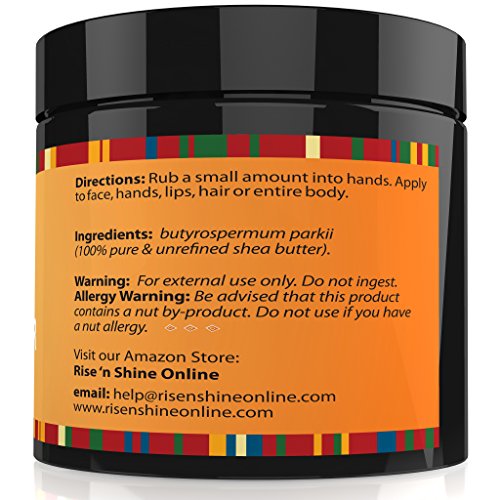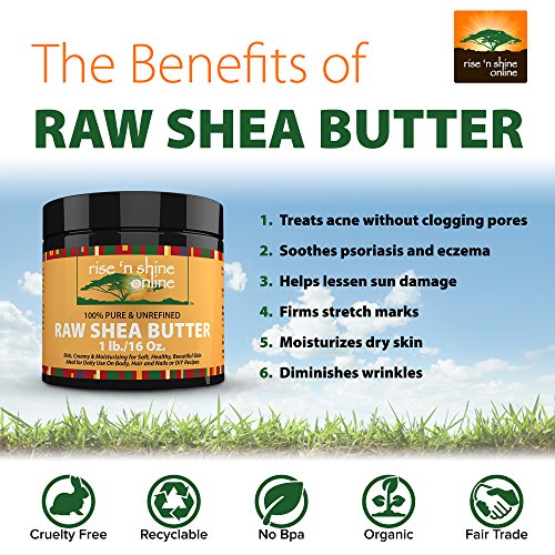 -. Feature : 100% ORGANIC SKIN SOLUTIONS! Shea Butter aids in your skin's natural collagen production and has exceptional healing and moisturizing properties for skin. Improves small blemishes, stretch marks, scars, wrinkles, eczema & dermatitis. Properties can help treat skin allergies, insect bites, sunburns, frostbites & more. It protects your skins natural oils and leads to a significant decrease in dryness. / DON'T BE PERSUADED INTO BUYING LOW QUALITY SHEA BUTTER! Our Unrefined Raw Shea Butter has an all-natural Ivory color, is totally organic and imported directly from Ghana. Cruelty free. No chemicals, additives or fillers. / READY TO USE RIGHT OUT OF THE CONTAINER! No adding ingredients, watching complicated videos or scouring the internet trying to find a workable solution to use your butter. Our Unrefined Raw Shea Butter is provided ready to use straight out of the container. Use like a lotion or in addition to your favorite hand cream, body butter recipe or soap base. / GUARANTEED TO BE FRESH! Double-sealed from the manufacturer, we guarantee you will receive a full 1 lb of fresh Shea butter that is easy to work with for use in all your DIY lotion, shampoo, lip balms, restorative conditioner and deep treating masque recipes! / BONUS EBOOK - Included with every purchase, you will receive an Ebook that teaches you about the uses and benefits as well as a few recipes to get you started with your new product! Every Rise 'N Shine Online product comes with a 30-Day Money Back Guarantee. So click the Add to Cart button now and order your own Raw Shea Butter today!