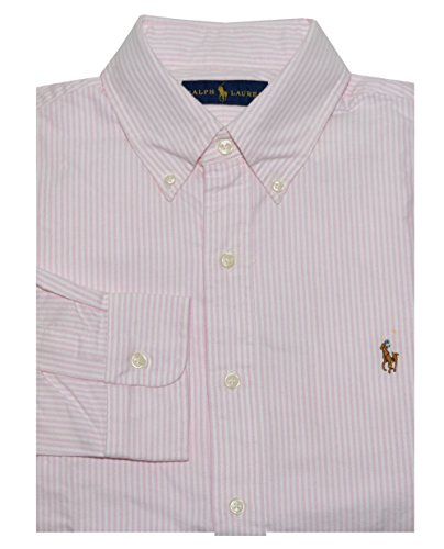 Ralph Lauren Men Long Sleeve Oxford Striped Pony Logo Shirt (Medium, Pink/White)