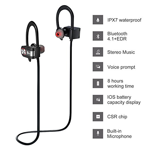 -. Feature : INTERNATIONAL IPX7 STANDARD: With its entire enclosure reengineered,Our Headphone is the very first water resistant headphone.So now you are protected like never before against spills,splashes,and even dust. / HiFi STEREO SOUND: premium CSR Chipset with professional HD Stereo Tune,rich and high-performance sound pushes you to the next level. / VOICE: with CVC 6.0 Noise Cancelling technology reduce background noise,the integrated microphone lets you chat without external noise or other interference. / BLUETOOTH TECHNOLOGY: Bluetooth 4.1 offers a faster,longer,more energy efficient connection so you can connect with 2 phones at the same time,play music for up to 8 hours,Connection distance up to 30 feet. / WARRANTY: Don't worry about the product quality,we provide lifetime warranty [except:Human Damage] and 7*24 Email services.