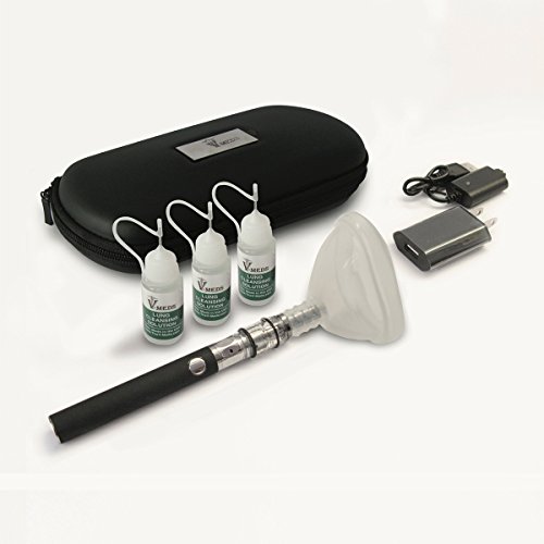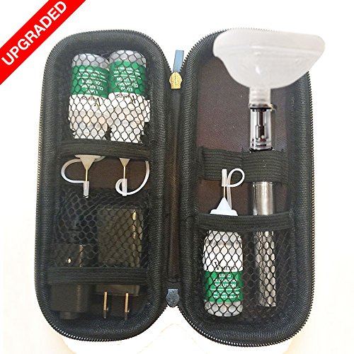 The kit includes soft leather ballistic case, 1 battery, 1 tank (pre-filled with mild solution), 1 USB cable, 1 wall Plug and 3 easy fill bottles with mild, medium and strong solution