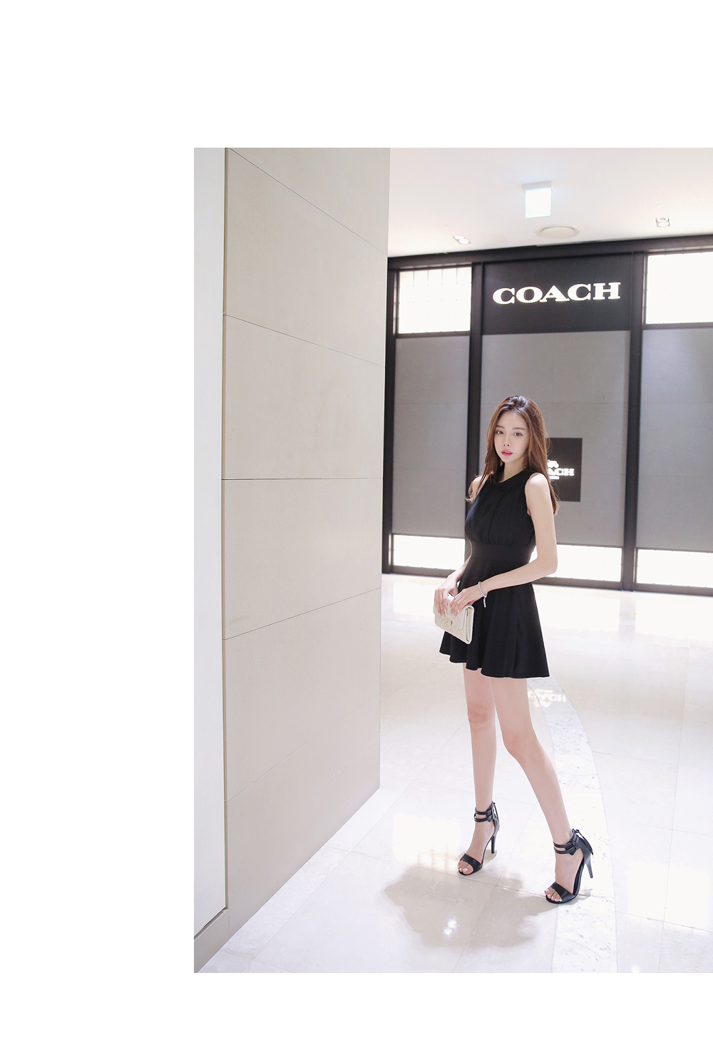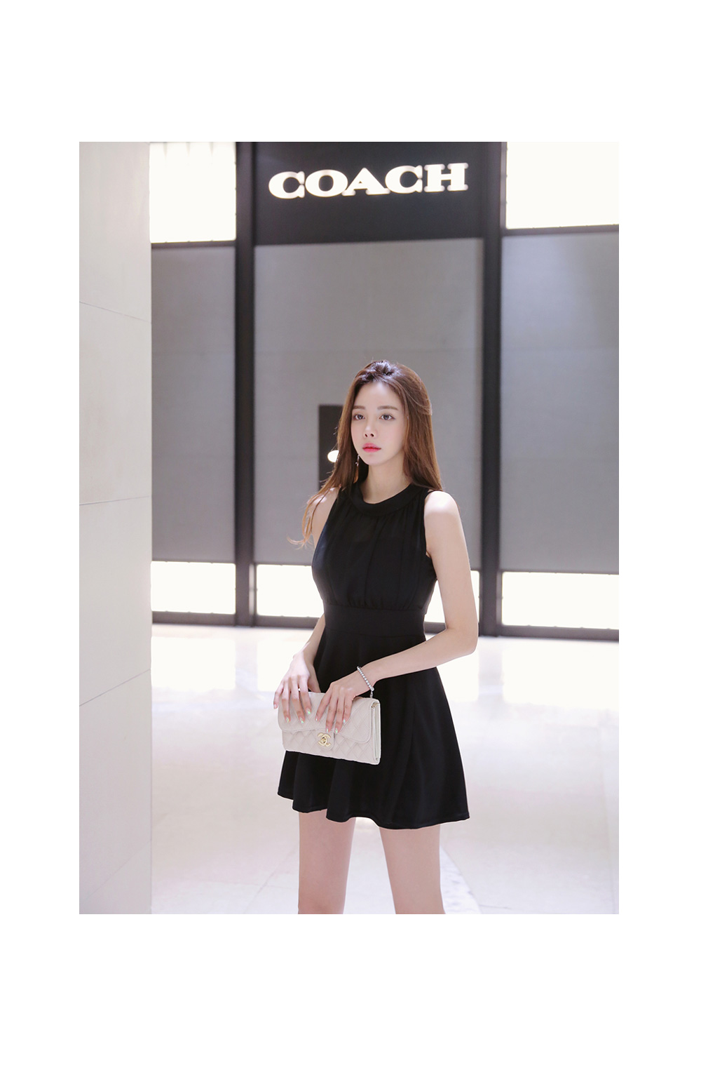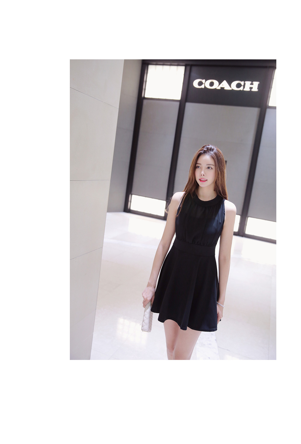 가슴선 아래로 퍼지는 플레어 라인으로 볼륨감은 살리면서 예쁜 라인의 실루엣을 만들어 주구요. 미니멀한 기장감으로 깔끔하면서 발랄한 분위기도 더해주었어요.