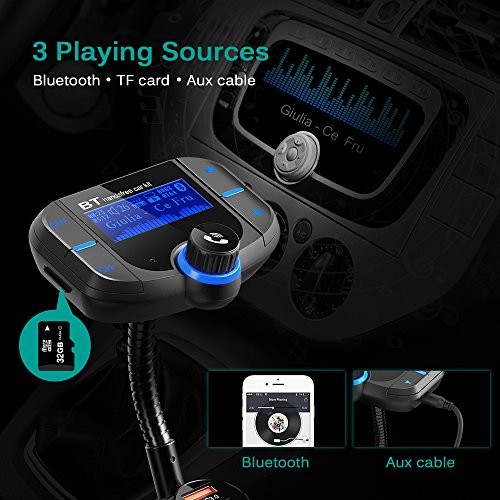 Car Radio Transmitter: It transmits music from the Bluetooth-enabled phones or SD card(Max 32 GB) to your car radio without Bluetooth. You can also connect it to your car stereo system via the provided 3.5mm audio cable