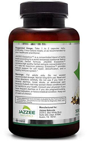 -. Feature : CLASSIC ESSIAC TEA - ONLY BETTER! Our Essiactive Tea Capsules start with the same classic blend of herbs used for years in the traditional Native American herbal formula for Essiac Tea. We then improve upon this recipe by using 4:1 extracts for 4X the potency and 4X the value, by using only organic stabilizers, and by making a product that is 100% vegan. The result is a product that provides an enhanced, extra strength form of Essiac Tea like no other! / 4X CONCENTRATED EXTRACT FOR STRONGEST ESSIAC AVAILABLE: Our Essiactive Tea Capsules are made from herbs that are 4:1 extracts. This means that the herb itself has been concentrated, so that 4 grams of the original herb are concentrated into a single gram. By using 4:1 extracts, we have created a powerful supplement that is 4X stronger than any other Essiac Tea capsules. This concentrated formula means that a single Essiactive Tea Capsule is equivalent to four capsules of other products. / SUPER VALUE: Each bottle contains 180 veggie capsules, and each capsule is 500 mg. Because Essiactive Tea Capsules are made from 4:1 extracts, this is like getting 720 capsules of "regular" Essiac tea capsules in every bottle! / 100% VEGETARIAN AND NO CHEMICAL FILLERS: Our Essiactive Tea Capsules are derived from all-natural, vegan, non-GMO sources. While other competing products use various chemicals as fillers, binders, and excipients, our Essiactive Tea Capsules instead uses a unique blend of certified organic ingredients. One of these ingredients, Organic Acacia Powder, provides the added benefit of being a prebiotic, which feeds and encourages the growth of healthy probiotics. / GOLD STANDARD PRODUCTION: Your health and safety mean everything to us. For that reason, our Essiactive Tea Capsules are manufactured in the USA, in an FDA certified facility with adherence to good manufacturing policies and under the most stringent quality control. You can rest assured that you get the best value for your money!