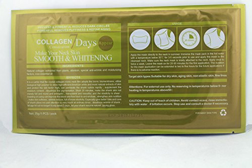 -. Feature : COLLAGEN Consecution 7 Days Make Your Neck Skin SMOOTH & WHITENING ! / Anti-winkle; Deep moisturizing and wrinkle smoothing; Enriched with moisturizers / Prevent & Refine Aging. / PREVENT & POWERFUL REDUCES DARK CIRCLS POWERFUL REMOVES PUFFINESS & REFINE AGING / Package include 5pcs of collagen neck masks