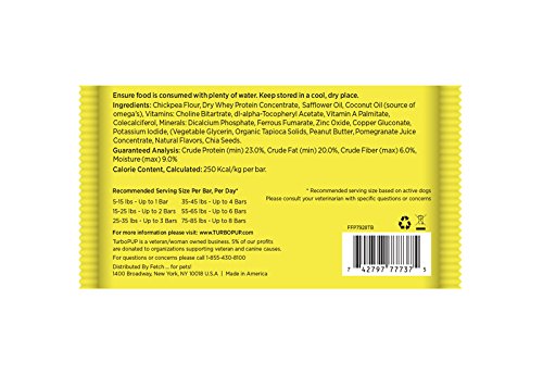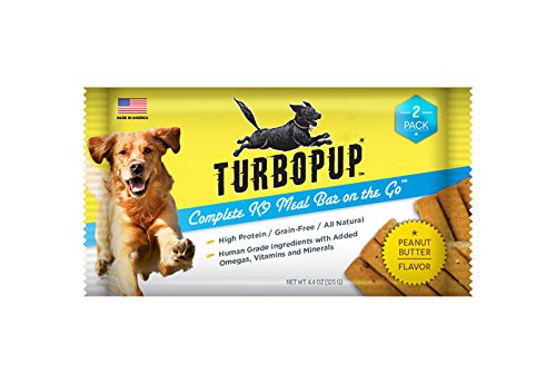 If you and your dog are always on the go, then these 100% grain-free, all-natural, TurboPUP Complete K9 Meal Replacement Bars in yummy peanut butter flavor may be just what you and your dog need. Each bar contains quality ingredients with added omegas, vitamins, and minerals, to make sure your dog gets a healthy meal replacement. Taking dog food along on a hike, or a driving trip, isn't always easy. Feeding your dog regular dog food in the car can be messy and carrying enough dog food for a day-long hike can make your pack too heavy. These meal replacement bars are easy to pass to your pet in the car and are lightweight enough to carry several in your backpack to last a few days. They're convenient, healthy, nutritional, and easy to carry. And, your dog will love the peanut butter taste, too.Feature