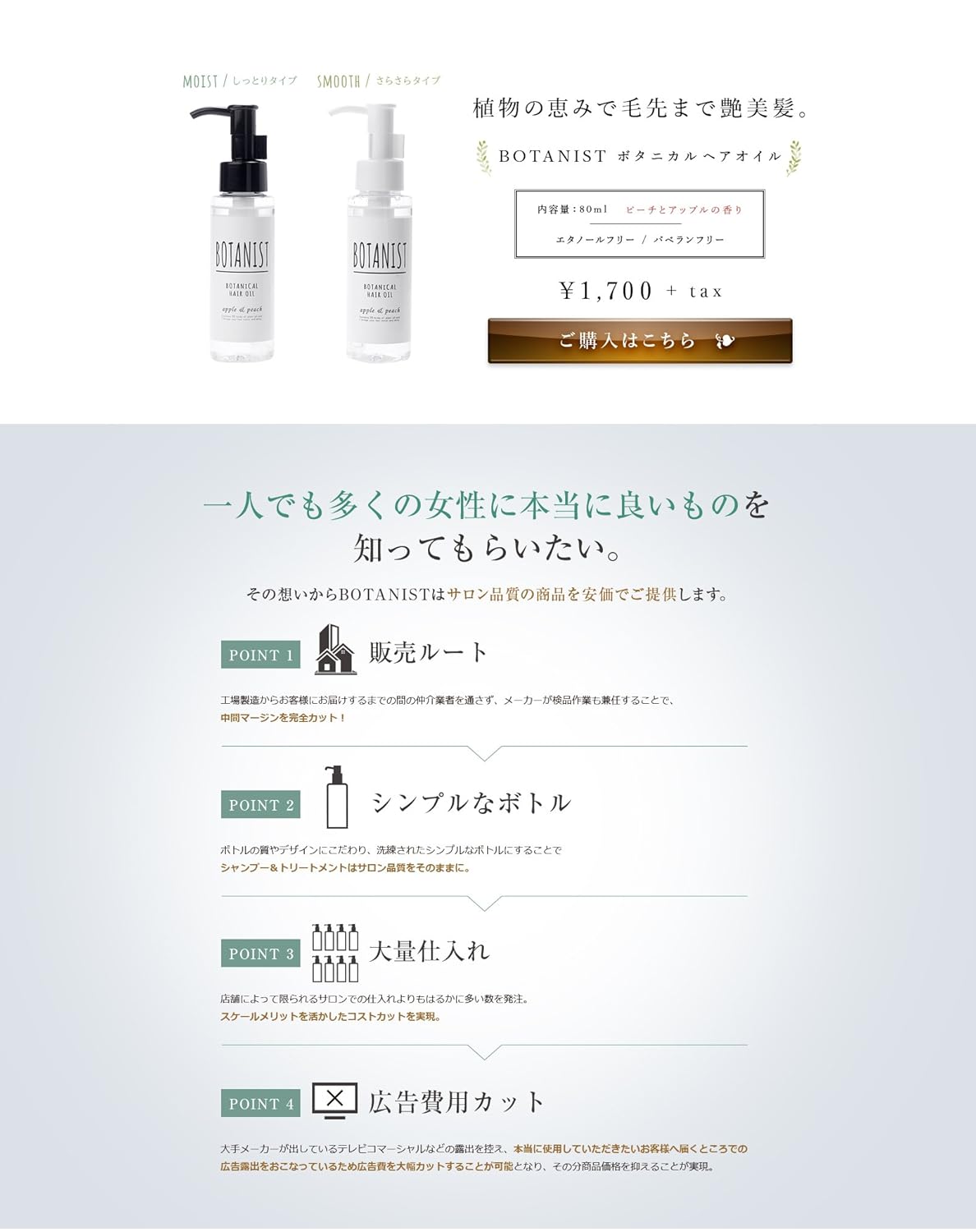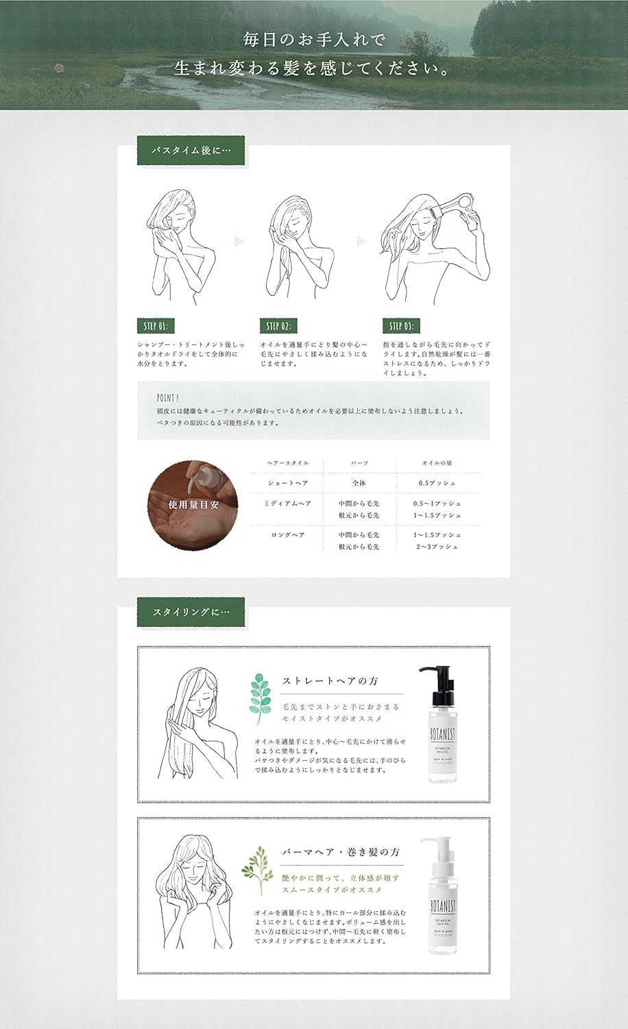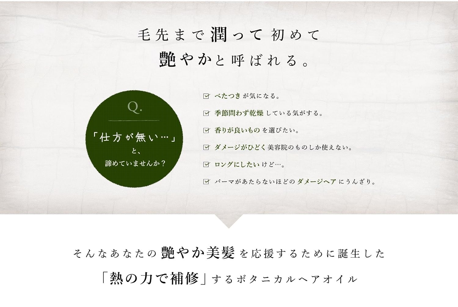 自然志向のやさしさにこだわり20種類の天然植物保湿オイルを絶妙に配合しました。 芯まで潤いを与え閉じ込めるから、やわらかく潤いに満ちた艶美髪に仕上げます。