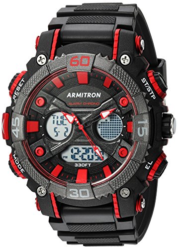 Sport watch featuring luminous hands, day/date LCD display, chronograph, lap time, pacer, five alarms, dual time, military time, 100 year calendar, countdown timer, hourly chime, and backlight with three second delay
