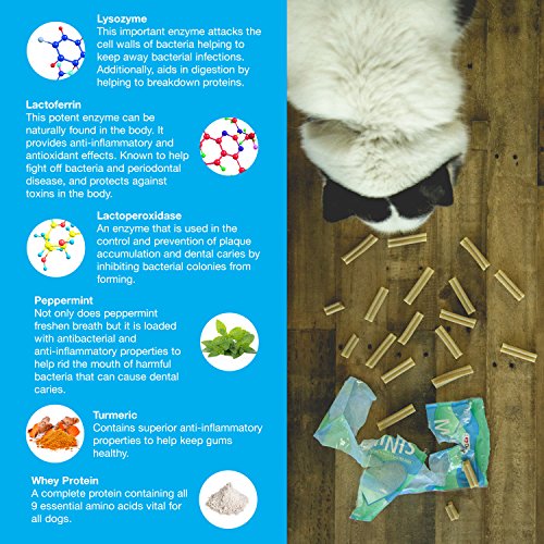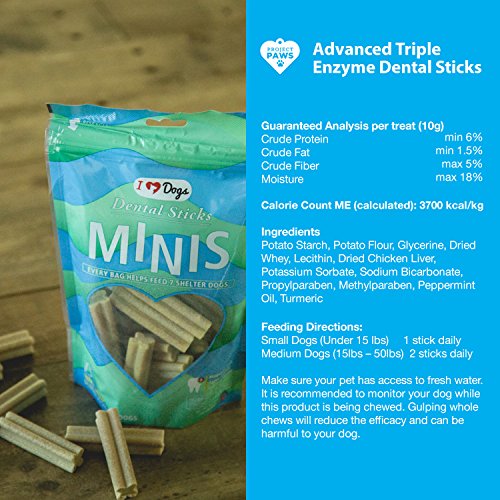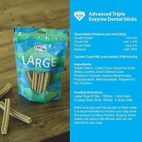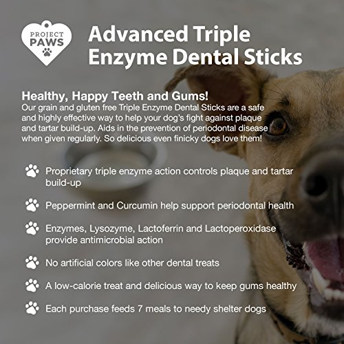 -. Feature : VETERINARIAN FORMULATED TRIPLE Action Enzymatic Oral Hygiene Formula: Fights Plaque, Controls Tarter, and Freshens Breath. / TRIPLE ENZYME: The Antimicrobial properties of Lysozyme, Lactoferrin and Lactoperoxidase Work in Combination with Naturally Abrasive Cleansing Action to Keep Your Dogs Mouth Healthy and Fresh. / LOW CALORIE, LOW FAT Dental Care Just 37 Calories Per Small Dental Stick, and 74 Cal Per Large Dental Stick. / EASY TO DIGEST and have a biological value of 100%. Contains Peppermint and the Flavonoid Curcumin Which Helps Support Periodontal Health. / GIVES BACK TO SHELTER ANIMALS! Project Paws Makes the Only Dental Stick That Provides 7 Healthy Meals to Shelter Dogs, So You and Your Dog Feel Good About Your Purchase.