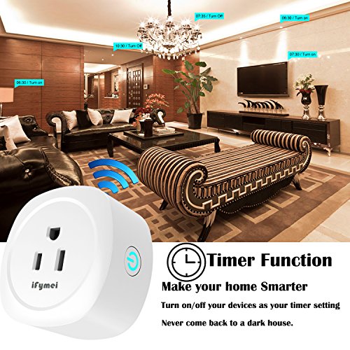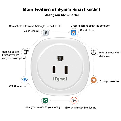 iFymei Intelligent Wifi Smart Plug Remote Control Your Device from Anywhere, Make Your Life Easier , Voice control by Amazon Alexa& Google Assistant. You can remote control your home electronics through internet at anytime and anywhere, Your home electronic device just Plug in iFymei smart plug, connect your home electronics with your smart phone by free APP " Smart Life", the smart plug work with Amazon Alexa and Google Assistant Voice control your home electronic from anywhere .