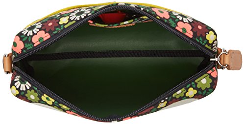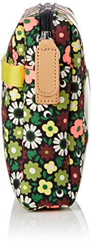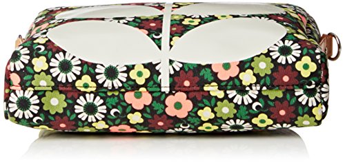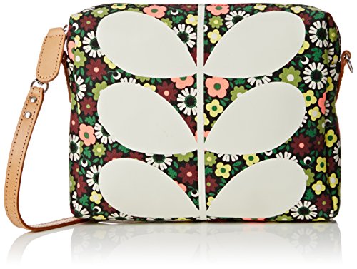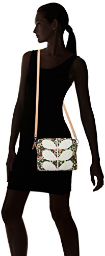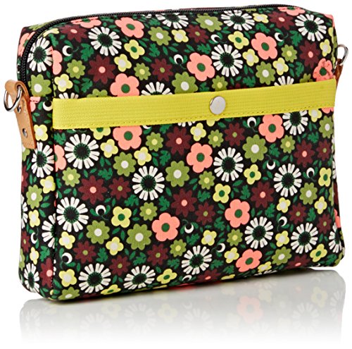 Full bloom' print small cross body bag, with white multi stem printed on front. Zip closure. Outer slip pocket with popper closure. Detachable leather shoulder strap. May be worn on shoulder, cross body or as a clutch. Inside details include slip pocket, elastic key chain, contrast colored binded seams. Green opaque laminated interior finish.