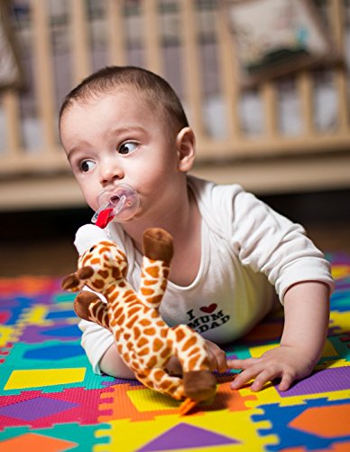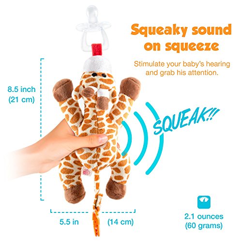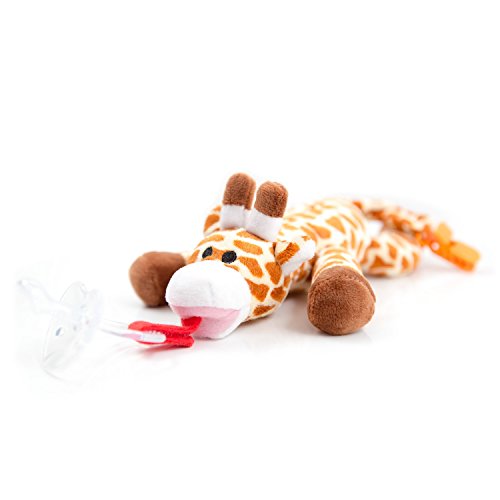 The BabyHuggle Giraffe is the ideal accessory for your baby. It is a soft and cute plush toy that is connected to a dummy to stimulate and soothe your baby. With a simple flick of your thumb, you can clip the tail to your baby's bib, car seat straps or stroller. It is also equipped with a squeaker to stimulate your baby's hearing and interest. It is well sewed and made from durable high-quality materials. 100% safe for your baby, BPA & Phthalates Free. It is also a perfect Baby Shower Gift for both boys and girls!It comes complete with a free one-piece Detachable Orthodontic Pacifier made of 100% silicone. It is high-quality, durable, safe, healthy and comfortable. It can be easily removed for washing and sterilization.
