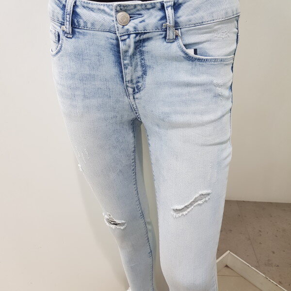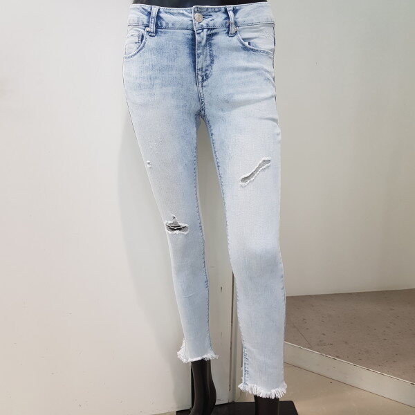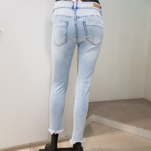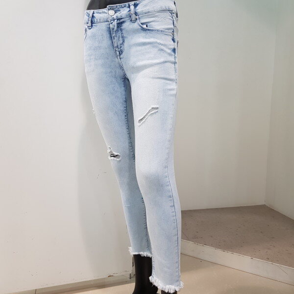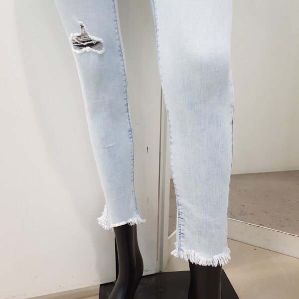 18 S/S 신상.여자 ICE톤 솔트 밑단변형 미드라이즈 크롭 스키니핏 데님 팬츠 입니다. 아이스 컬러 톤의 워싱감에 그레이시한 얼룩이 작업을 가미한 데님 팬츠 입니다. 몸판에 포인트 오픈구제와 밑단에 불규칙하게 컷팅하여 좌우 언발란스하게 올풀리는 포인트 디테일로, 다양한 아이템과 매치가 자유로와 코디가 쉬운 데님 팬츠 입니다.