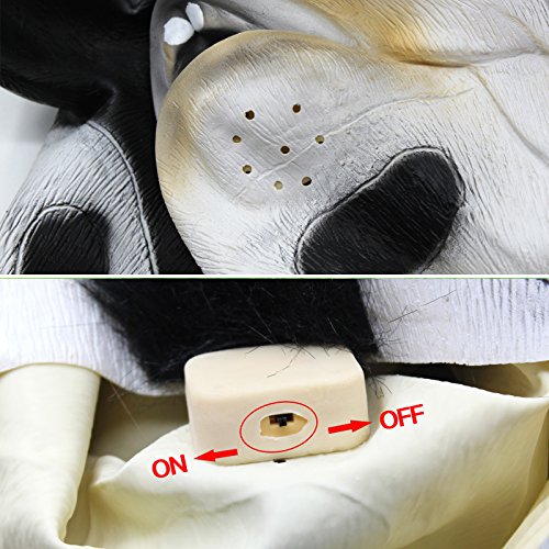 The moo will make you unique in your party. Keep the switch on just like the piture 2, it moos when shaking the mask.