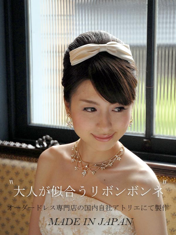 大人かわいい花嫁に♪ 挙式はティアラとロングベールで正統派にしたので、披露宴はリボンボンネでかわいくしたいと思ったのですが、30代のオトナ花嫁に似合いそうな物がなかなか無く・・・。やっとこちらの商品を見つけました! サイズも大きすぎず、シルクサテンの光沢が上品です。 ウェディングドレスのイメージとも良く合っていたと好評でした☆ |