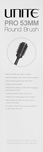 Our 53mm Round brush is designed to dry and shine. With its special heat-activated metal barrel that turns color letting you know when to remove heat and when to release hair. The barrel goes from black to white when barrel is fully heated, and back to black when cool – you’ll never over dry hair again. And its nylon and boar bristle blend delivers volume and shine every time; nylon bristles aid in holding the bend in hair while the boar bristles shine and polish.Feature