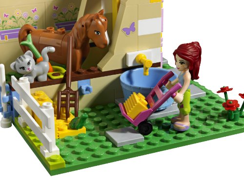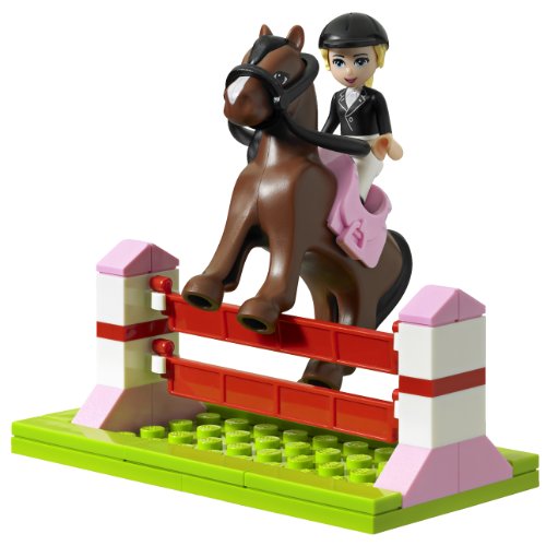 - Feature : Features a barn with 2 horse stables, hand trolley, a well with bucket and fencing / Accessories include carrots, cups, a book, pitchfork, a brick separator, 2 practice jumps, 2 riding helmets, 2 saddles and 2 bridles and an animal accessory set with brushes, comb, bows, hairspray, soap and prize ribbons / Includes everything you need to care for the LEGO Friends horses / Prepare for the competition with the saddles and practice jumps / LEGO mini-dolls are figures made especially for the world of LEGO Friends, with thousands of customizable fashion and accessory combinations