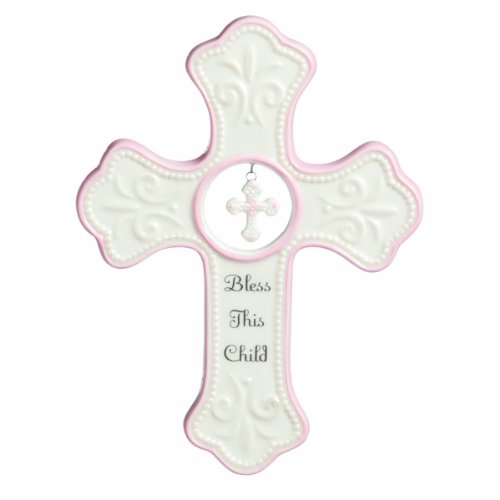 [Product Information]- Porcelain cross with embossed scroll detailing and pink trim reads : "Bless This Child"