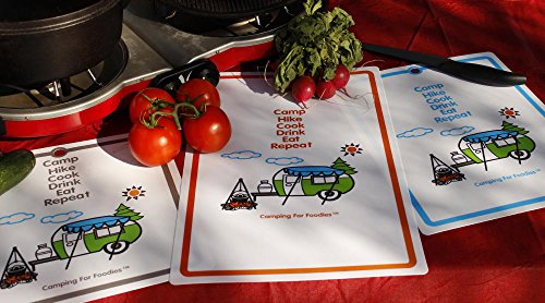 Camping For Foodies Flexible Cutting Mats With Retro RV Camper Trailer Theme Design, Set of 3. Fun Message. Camp, Hike, Cook, Drink, Eat, Repeat.