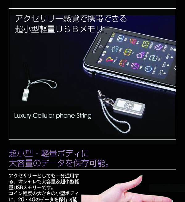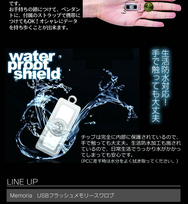 | アクセサリーとしても十分通用する、オシャレで大容量&超小型軽量USBメモリーです。お手持ちの鎖につけて、ペンダントに、付属のストラップで携帯につけてもOK!日常生活防水機能付。 |