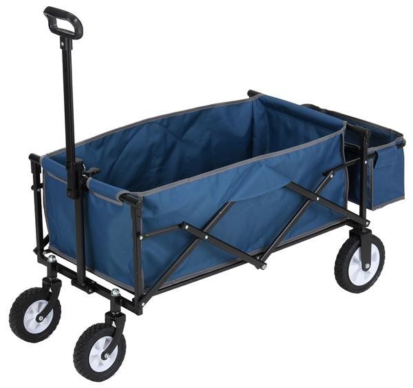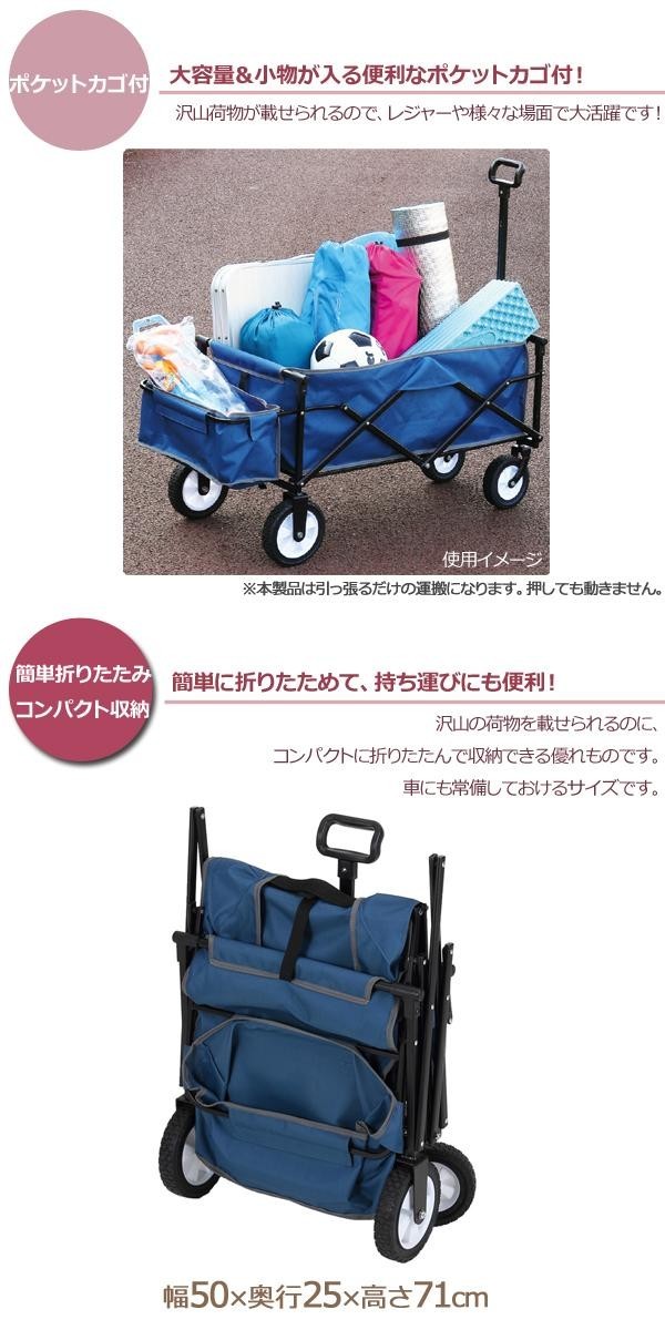 コンパクトに収納可能で、持ち運びにも便利。車のトランクに常備しておけるサイズです。キャンプやレジャー・その他様々な場面で大活躍してくれます!小物を収納できるポケットカゴ付。※本製品は引っ張るだけの運搬になります。押しても動きません。 |