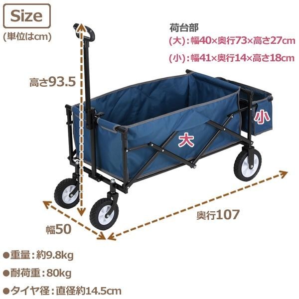 | サイズ | 使用時(約):幅50×奥行107×高さ93.5cm(持ち手含む)、荷台部:(大)幅40×奥行73×高さ27cm・(小)幅41×奥行14×高さ18cm、収納時(約):幅50×奥行25×高さ71cm 個装サイズ:74×55×22cm |