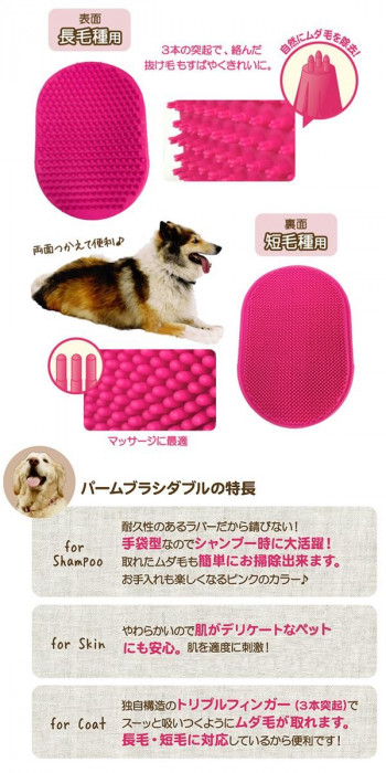 | 長毛・短毛ダブルで使えて、大型犬もラクラクなサイズ!!手袋型でシャンプー時にも便利です。独自構造の突起がムダ毛を除去し、やわらかいゴムの適度な刺激で毛ツヤをよくするマッサージ効果もあります。 |