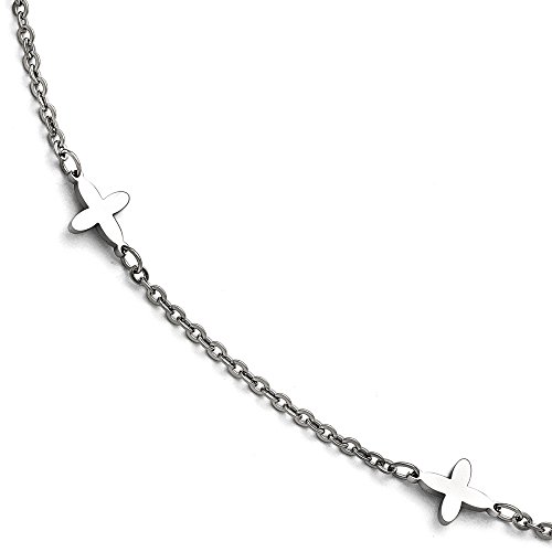 The beauty of this cross anklet is in the simplicity of the design and the bright metallic luster of the stainless steel construction. It features three 9mm by 11mm (3/8 x 7/16 inch) cross charms stationed on 2mm width cable chain that closes with a spring ring clasp and is adjustable in length from 9 to 10 inches.Feature