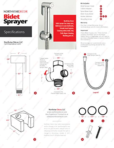 Simple and Easy to install. Includes one Brass Sprayer, T-Valve, Wall Mount Holder, and Stainless Steel Hose (4 feet/ 1.2 Meter).