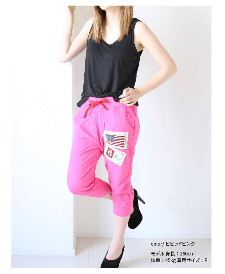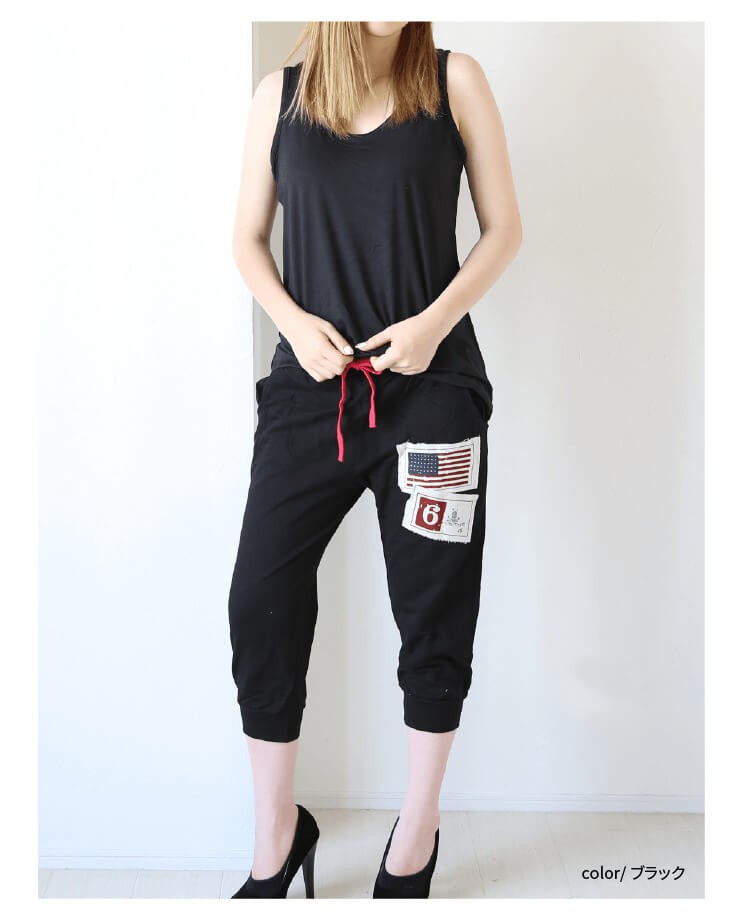 パンツ 総丈:約70cm ウエスト:約60~90cm ヒップ:約100cm 股上:約前29、後34cm 股下:約45cm わたり幅:約58cm 裾幅:約11cm |