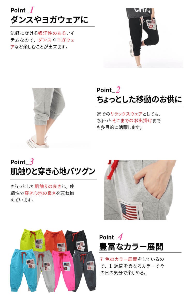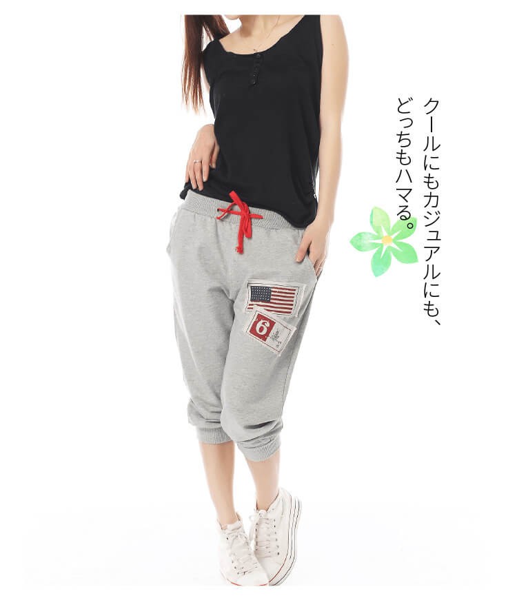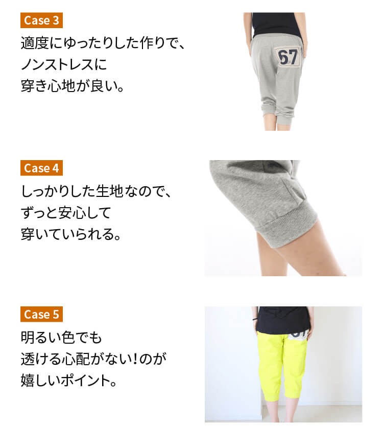 スポーツジム、ジョギング、旅行時、マリンスポーツ、お部屋着など様々な場面で活用OK♪ 生地はTシャツ生地より厚めで、伸縮性も多少あります。 |
