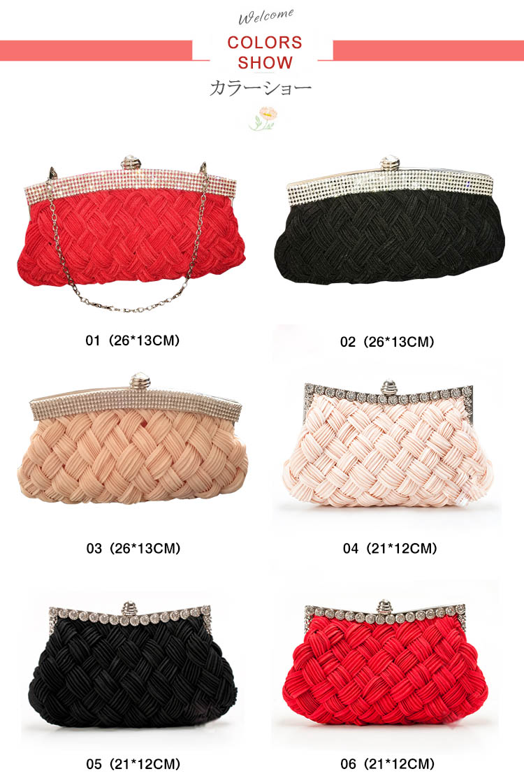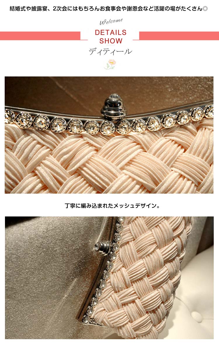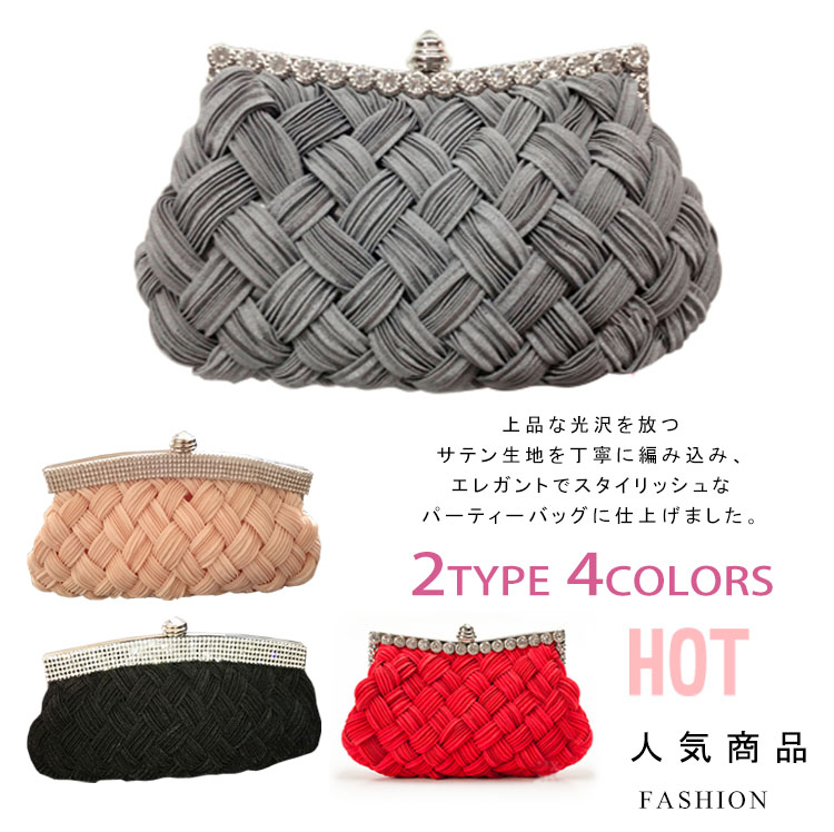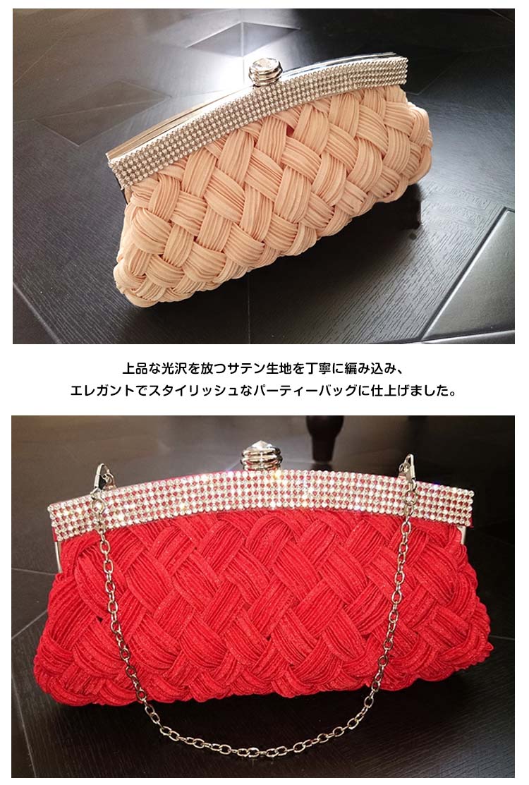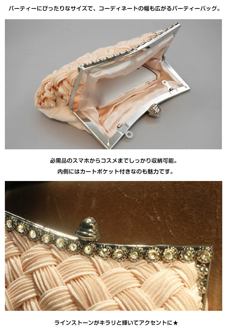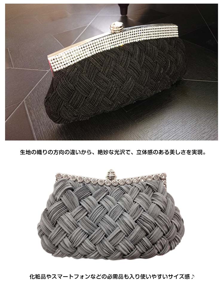| 上品な光沢を放つサテン生地を丁寧に編み込み、エレガントでスタイリッシュなパーティーバッグに仕上げました。 生地の織りの方向の違いから、絶妙な光沢で、立体感のある美しさを実現。 化粧品やスマートフォンなどの必需品も入り使いやすいサイズ感♪結婚式や披露宴、2次会にはもちろんお食事会や謝恩会など活躍の場がたくさん◎ | |