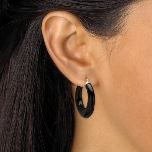 Let the exotic look of reconstituted onyx hoop earrings add that little bit of sassy elegance to your everyday wardrobe. Fashionable and fun to wear in 14k gold. - 32425