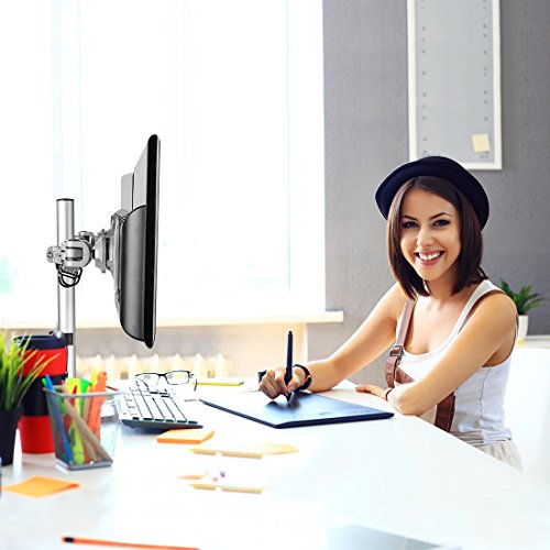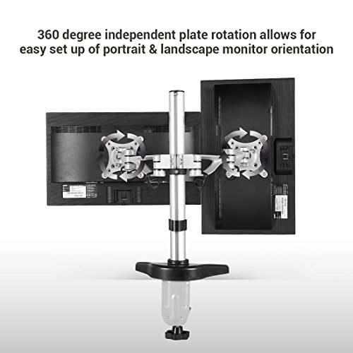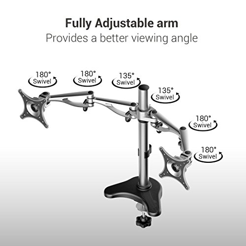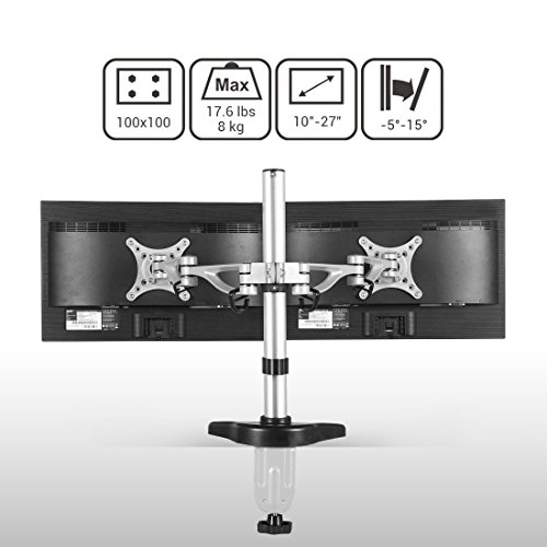 Weight Capacity: Supports up to 17.6 lbs (8 kgs) for each monitor; Tilt: -5 degrees to +15 degrees; Sw: 360 degrees (portrait or landscape); Swivel: Max 180 degrees; Maximum Height adjustable: 16.1-Inch (410 mm)