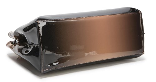-. Feature : Synthetic patent leather with fabric lining. Top zipper closure. / Two 5" handles. / Interior cell phone pocket, multifunctional slip, 2 zipper pockets. / Comfortably holds an iPad Mini or a tablet 8.5"x 6"x1" and under. / Size: 13" x 10" x 5"